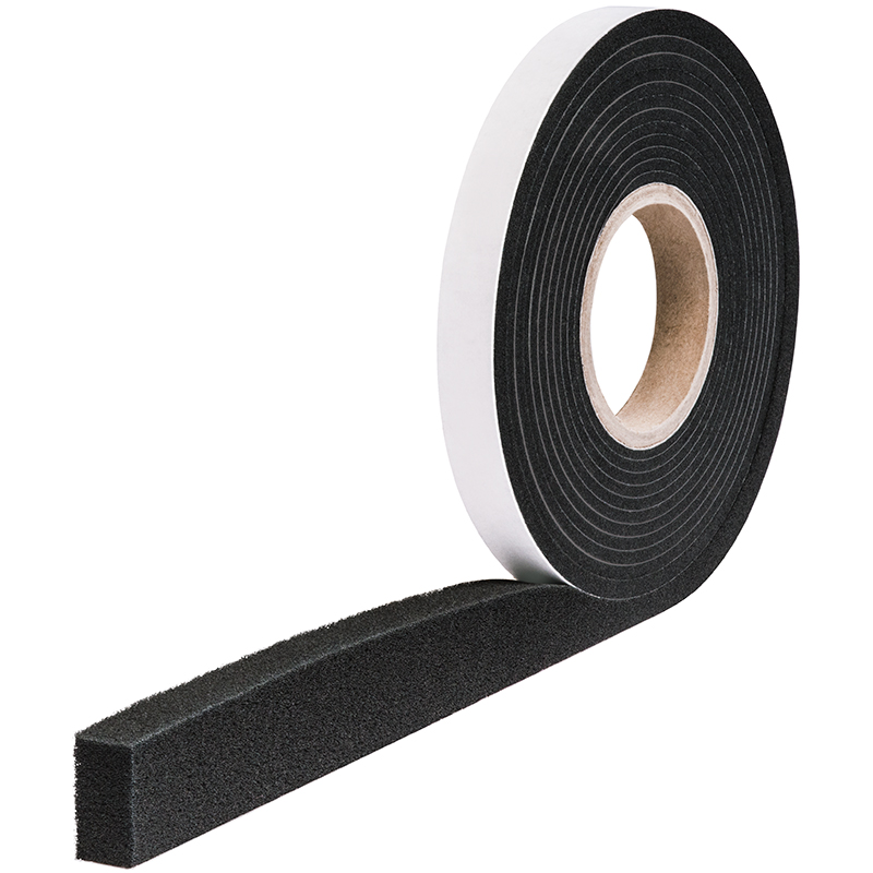 aus Polyurethanweichschaum mit Acrylat-Dispersionsimprägnierung, Hilfs- und Füllstoffen, vorkomprimierte Rollenware mit Acrylat-Haftkleber als Montagehilfe