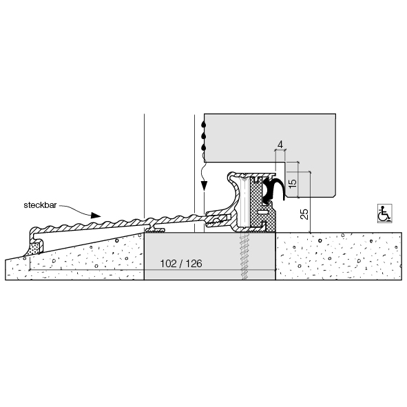 Aluminium, ungebohrt, 2-teilige Thermoschwelle, Grundprofil mit grauem Kunststoff-Isolator, Steckprofil zum Einclipsen, rollstuhlgängig