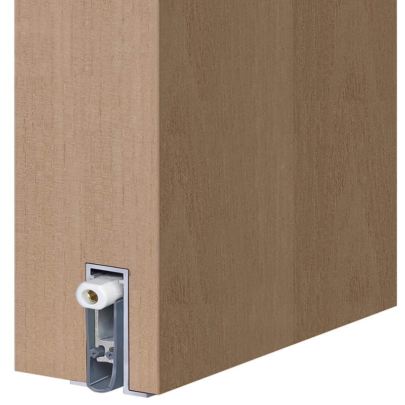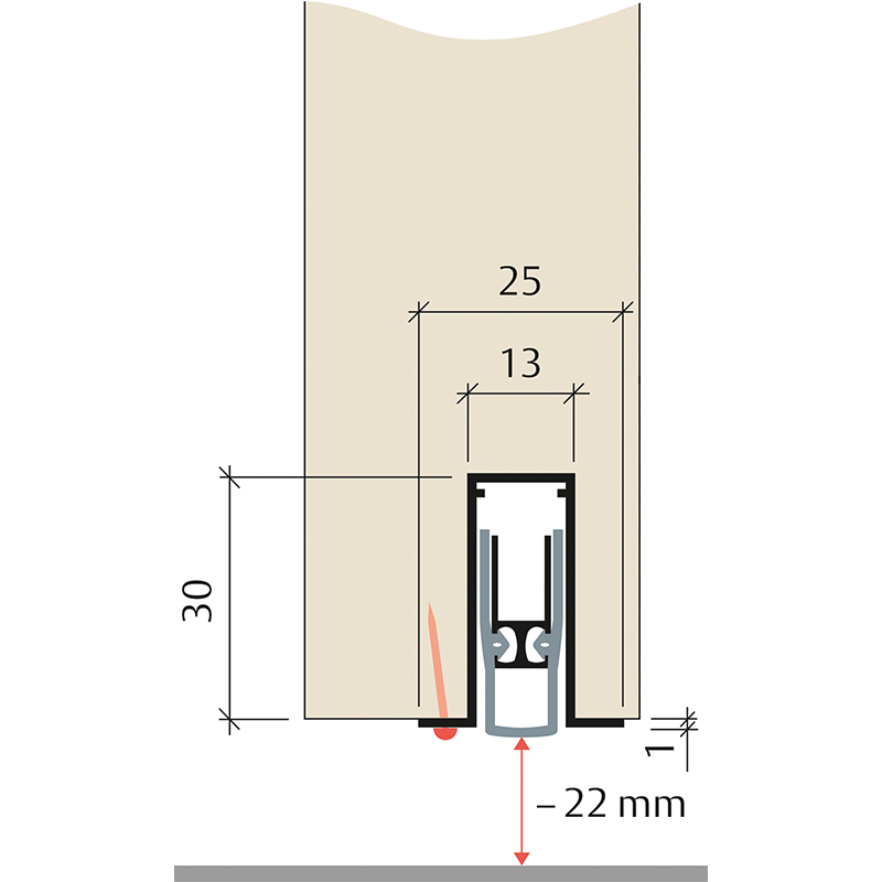 bandseitige Auslösung mit automatischem Ausgleich bei schiefem Boden, Parallelabsenkung, Dichtungshöhe bis 22 mm, Lippe aus Silikon, Schalldämmwert 48 dB bei Bodenabstand 7 mm, zum Einnuten bündig, Befestigung von unten