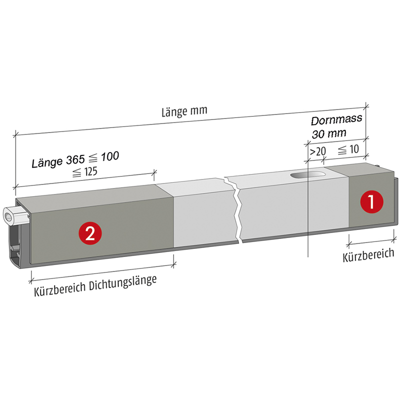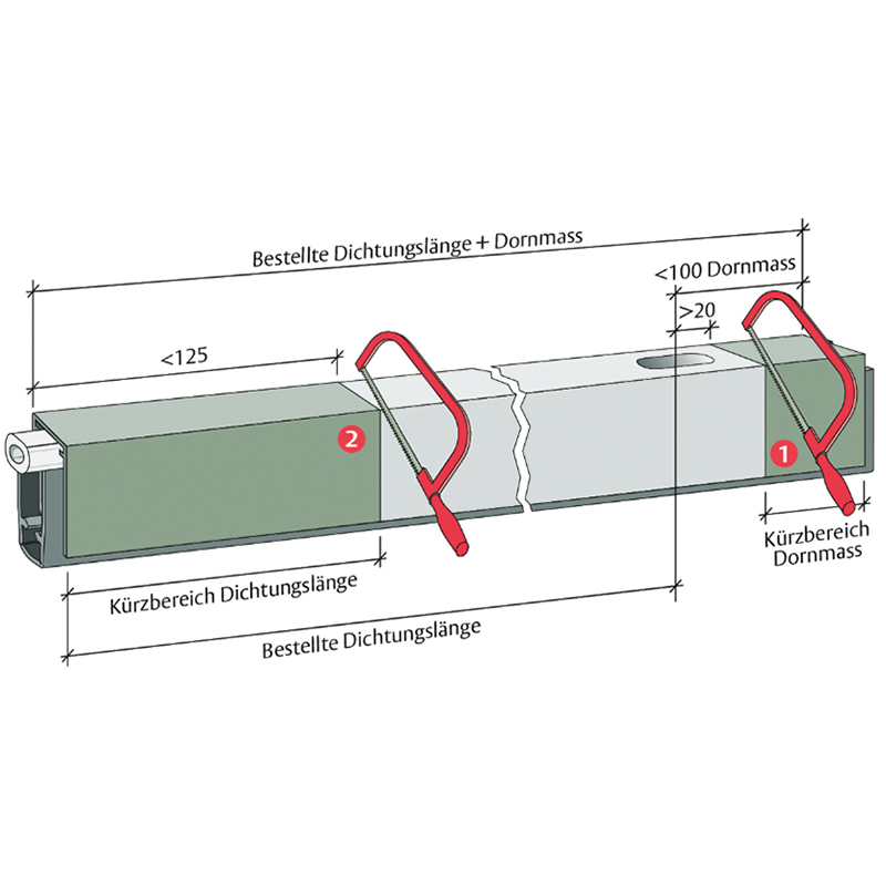 - Richtige Reihenfolge beim Kürzen: 1. zuerst das Dornmass kürzen (max. 10 mm möglich), 2. anschliessend die Dichtungslänge kürzen (siehe Tabelle)