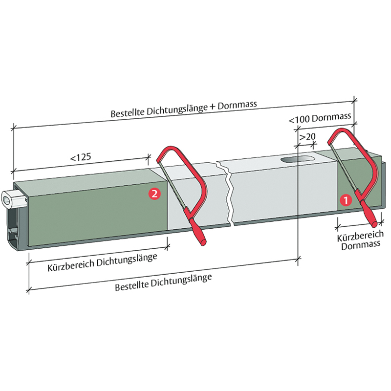 - Richtige Reihenfolge beim Kürzen: 1. zuerst das Dornmass kürzen (max. 10 mm möglich), 2. anschliessend die Dichtungslänge kürzen (siehe Tabelle)