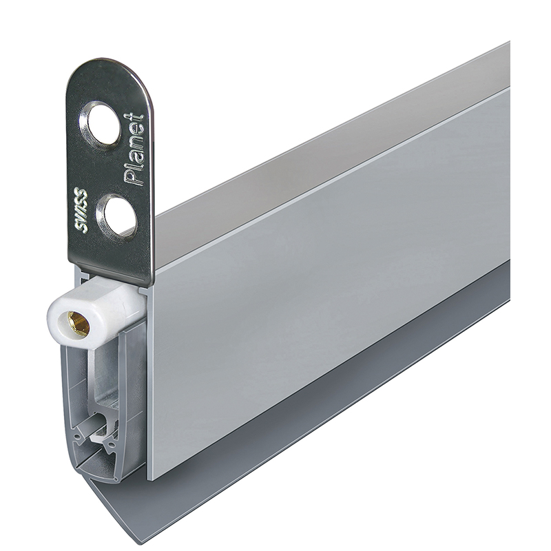 automatische Türabsenkdichtung für Schall-, Rauch- und Brandschutztüren, bandseitige Auslösung, passt sich dem unebenen Boden an, zum Einnuten bündig oder tiefer, Dichtungshöhe bis 27 mm, mit Schräglippendichtung aus Silikon, Schalldämmwert bis 44 dB, mit Montageset für seitliche Montage