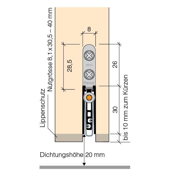 bandseitige Auslösung mit automatischem Ausgleich bei schiefem Boden, Parallelabsenkung, Dichtungshöhe bis 20 mm, Lippe aus Silikon, Schalldämmwert 48 dB bei Bodenabstand 7 mm, zum Einnuten bündig oder tiefer mit Lippenschutz, mit Montageset für seitliche Montage