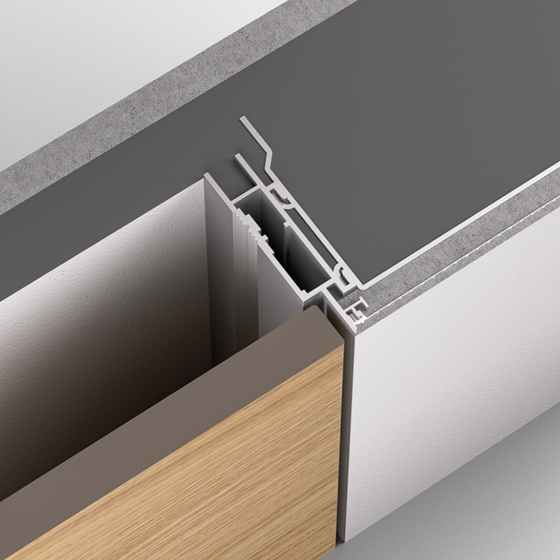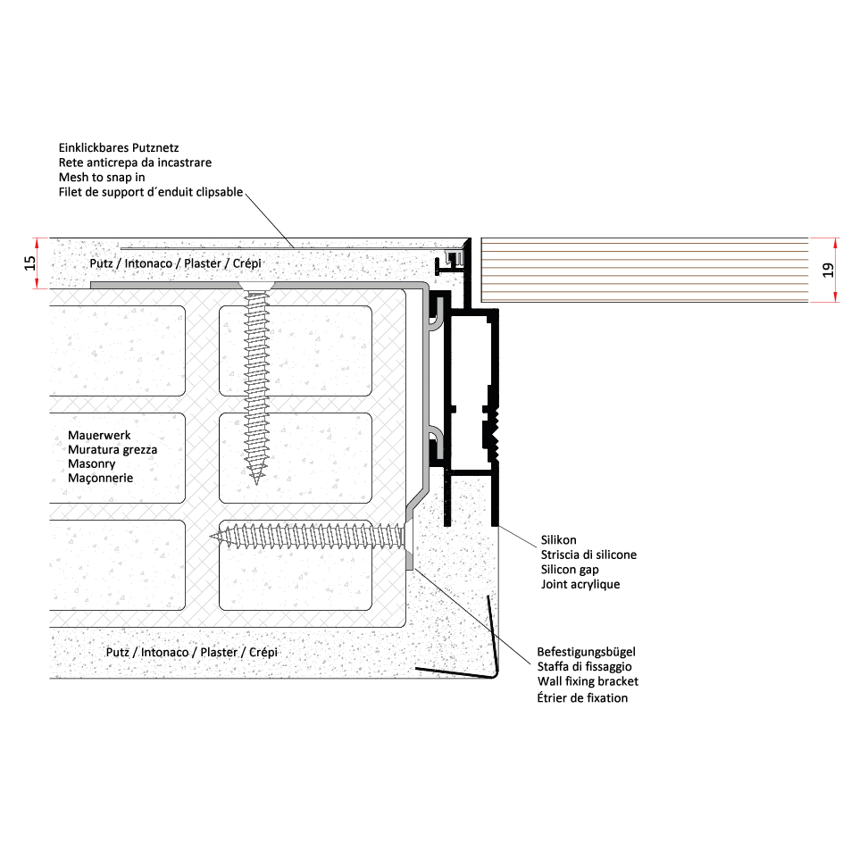 Profilé en aluminium pour niches murales sans cadre, convient pour la construction massive et sèche, raccord parfait au crépi et à la construction sèche grâce au filet de crépi encliquetable dans le profilé de niche, ce qui crée une liaison solide entre le profilé de niche et la maçonnerie/la construction sèche et empêche ainsi la formation de fissures, pour épaisseur de panneau de porte 19 / 20 mm