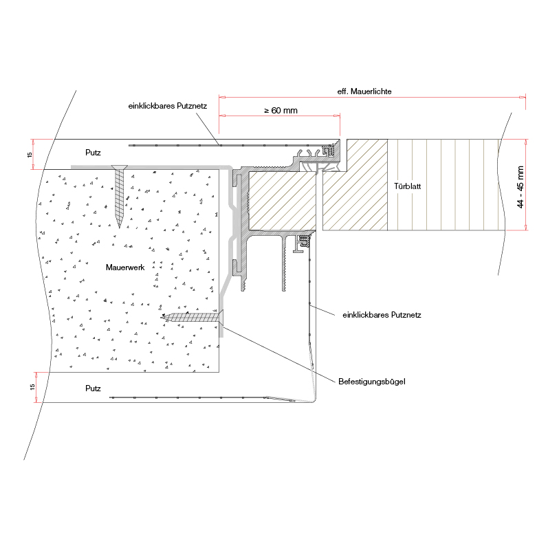 konfektionierte Aluminiumprofile für wandbündige Türkonstruktionen mit perfekter Kantenausbildung und filigraner Schattenfuge, ohne Probleme mit Haarrissbildung, die mit einer unästhetischen Acrylfuge verschlossen werden müsste, das mitgelieferte Putznetz wird in das Zargenprofil eingeklickt und stellt somit eine feste Verbindung zwischen Türzarge und Mauerwerk / Trockenbau her, für eine schnelle und fachgerechte Montage sind Montagebügel und Eckverbinder vorgesehen, mit Montageanleitung