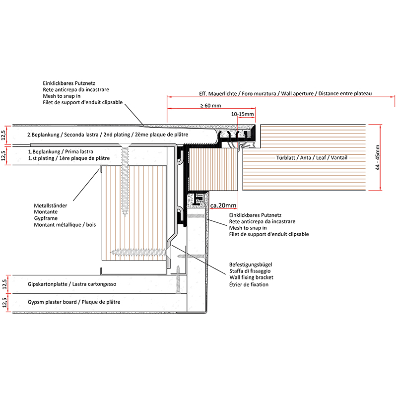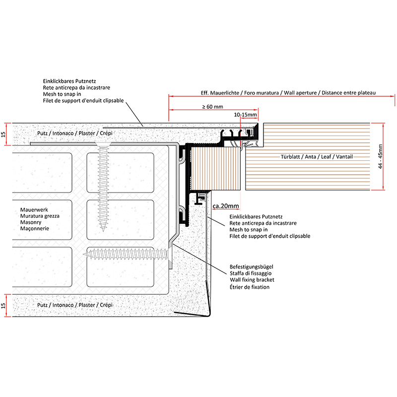 konfektionierte Aluminiumprofile für wandbündige Türkonstruktionen mit perfekter Kantenausbildung und filigraner Schattenfuge, ohne Probleme mit Haarrissbildung, die mit einer unästhetischen Acrylfuge verschlossen werden müsste, das mitgelieferte Putznetz wird in das Zargenprofil eingeklickt und stellt somit eine feste Verbindung zwischen Türzarge und Mauerwerk / Trockenbau her, für eine schnelle und fachgerechte Montage sind Montagebügel und Eckverbinder vorgesehen, mit Montageanleitung