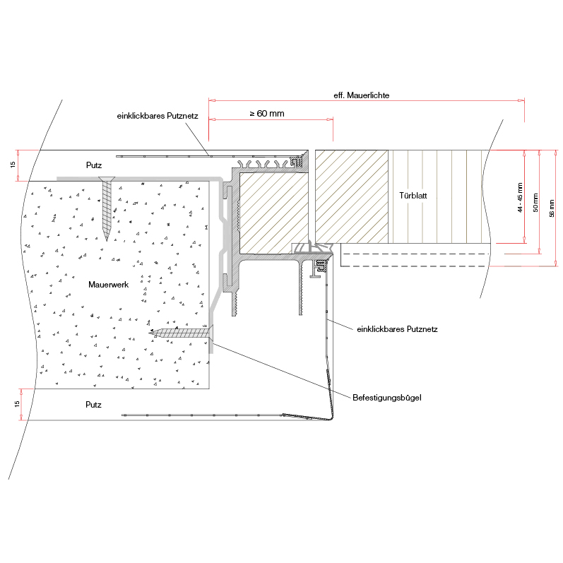 konfektionierte Aluminiumprofile für wandbündige Türkonstruktionen mit perfekter Kantenausbildung und filigraner Schattenfuge, ohne Probleme mit Haarrissbildung, die mit einer unästhetischen Acrylfuge verschlossen werden müsste, das mitgelieferte Putznetz wird in das Zargenprofil eingeklickt und stellt somit eine feste Verbindung zwischen Türzarge und Mauerwerk / Trockenbau her, für eine schnelle und fachgerechte Montage sind Montagebügel und Eckverbinder vorgesehen, mit Montageanleitung