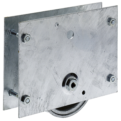 Stahl feuerverzinkt, 2 seitliche Platten verstellbar für Torstärke 38 - 56 mm, mit Präzisionskugellager, Rolle mit runder Rille für Rohr-Ø 27 mm, mit Befestigungsmaterial