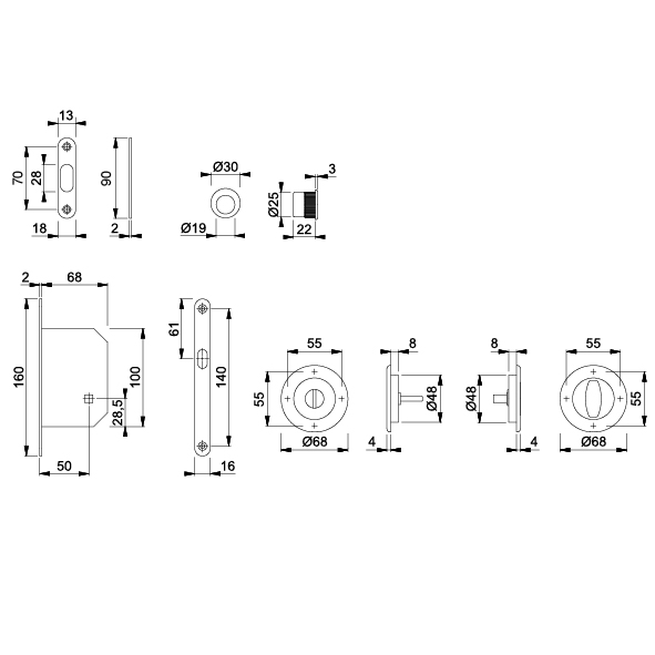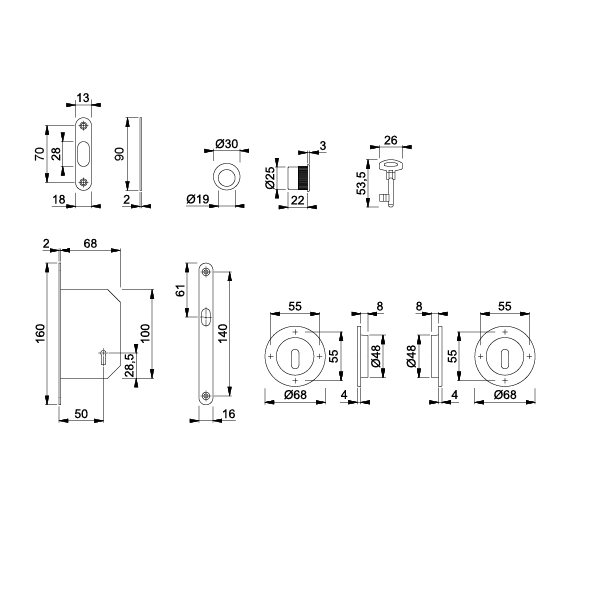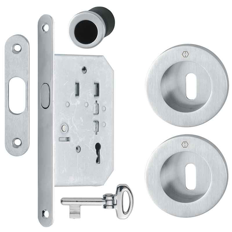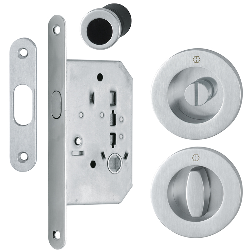 Messing verchromt satiniert, Einsteckschloss mit Haken, Schliessblech abgerundet 90 x 18 x 2 mm, 2 Schiebetür-Muscheln Ø 68 mm, Einlassmasse Ø 48 x 8 mm, Befestigung mit Mehrzweckschrauben, Ausführung BB mit 1 Klappring-Schlüssel Länge 53,5 mm, Ausführung WC mit Nuss 8 mm, mit Olive und Schlitzkopf, 1 Fingerhülse für Türstirnseite Ø 30 mm, Einlassmass Ø 25 x 22 mm, Befestigung mit Silikon oder Klebstoff