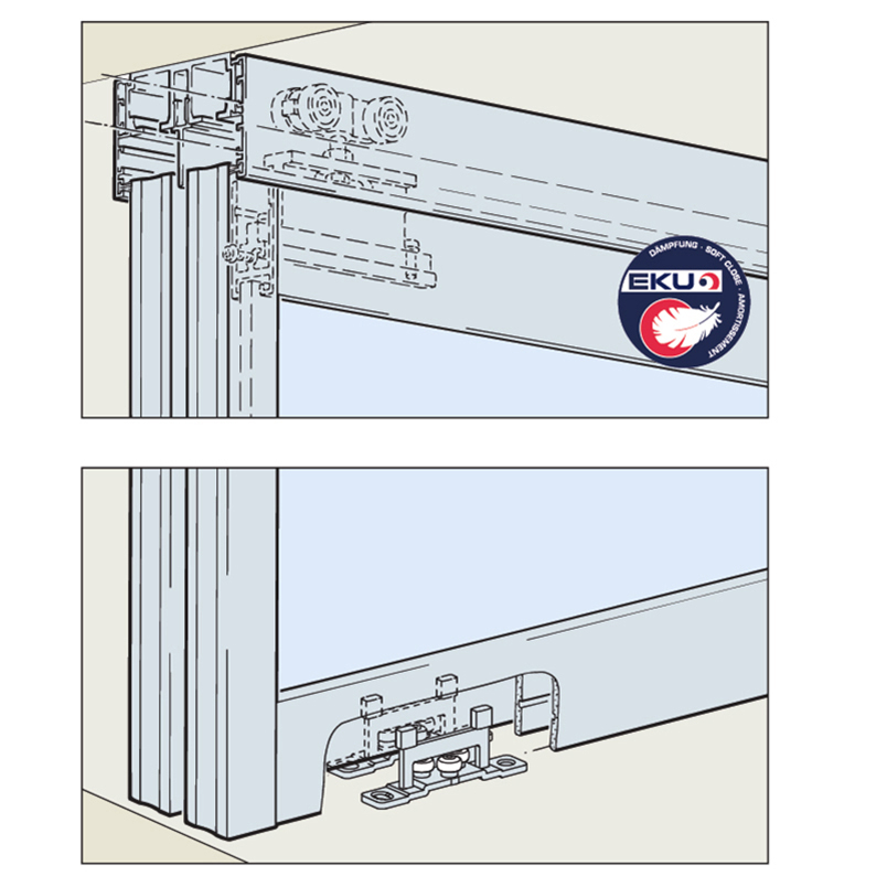 - Bei deckenbündigem Einbau der Laufschiene oder wenn der seitliche Zugang für das Ein- und Ausfahren der Dämpfung nicht gewährleistet ist, wird an der Laufschiene eine Montageöffnung (Ausfräsung) benötigt. Der Arbeitsaufwand in unserer Schlosserei für das Ausfräsen der Montageöffnung und Bohren Ø 2 mm in der Laufschiene für die Einzugsdämpfung wird als Zuschlag separat verrechnet: