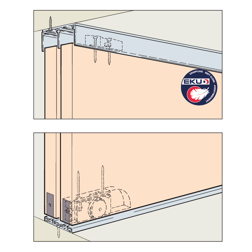 Raumtrennsystem, idealer Beschlag auch für begehbare Schränke, untenlaufend, Laufschienen für aufgesetzte oder versenkbare Bodenmontage, ohne Führungsschiene, ohne Zubehör