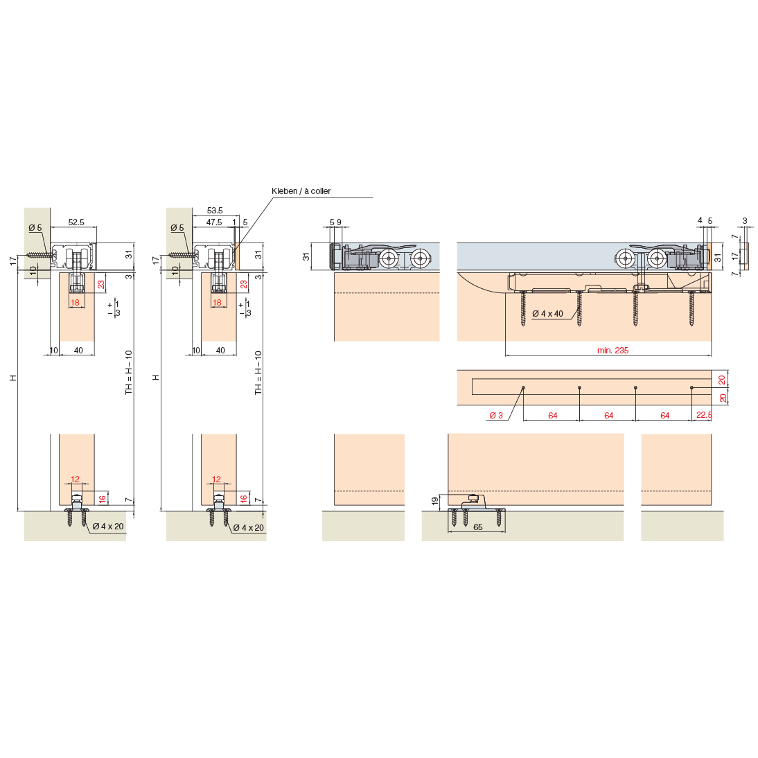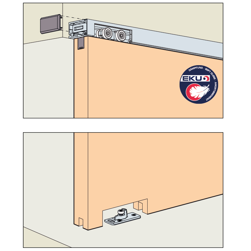 - Bei deckenbündigem Einbau der Laufschiene oder wenn der seitliche Zugang für das Ein- und Ausfahren der Dämpfung nicht gewährleistet ist, wird an der Laufschiene eine Montageöffnung (Ausfräsung) benötigt.