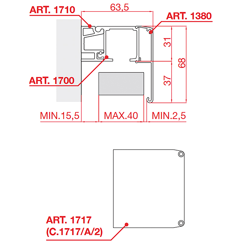 Laufschiene 1700 mit Wandhalterprofil 1710 und Abdeckprofil 1380