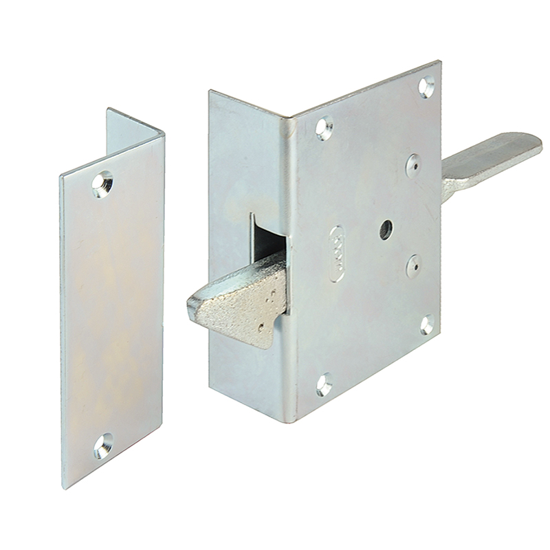Stahl verzinkt, zum Einlassen, DIN rechts und DIN links umstellbar, Hakenfalle und Bedienungsgriff aus Temperguss, Kastengrösse 110 x 140 x 40 mm, mit Winkelschliessblech, Schlüsselführung, Schlüsselschild und Zifferschlüssel mit Ring