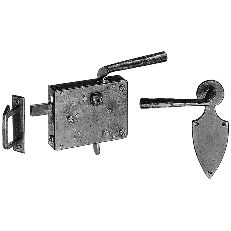 Schmiedeisen naturblank matt lackiert, mit hebender Falle, mit Nachtriegel,