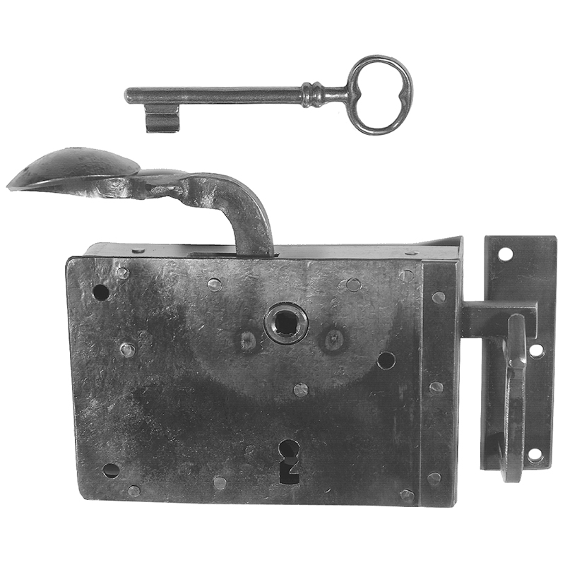 Eisen naturblank (geringe Korrosionsbeständigkeit), mit hebender Falle, inkl. Kloben für Überschlag 18mm, BB mit 1 Schlüssel gleichschliessend, ohne Drückergarnitur, Schrauben im Lieferumfang enthalten