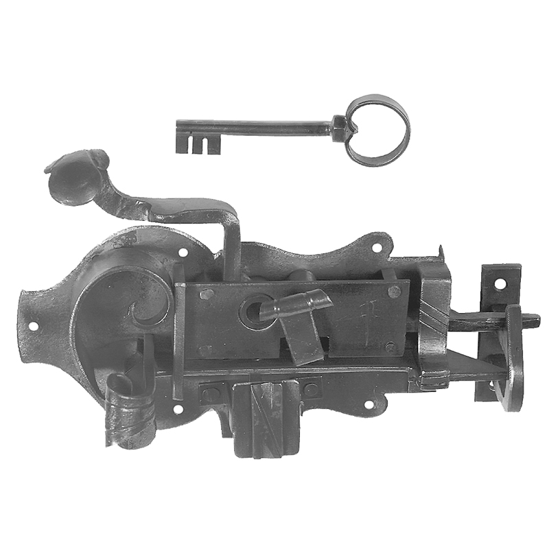 Eisen naturblank (geringe Korrosionsbeständigkeit) mit hebender Falle, inkl. Kloben für Überschlag 18mm, BB mit 1 Schlüssel gleichschliessend, ohne Drückergarnitur, mit Vierkantstift, Schrauben im Lieferumfang enthalten