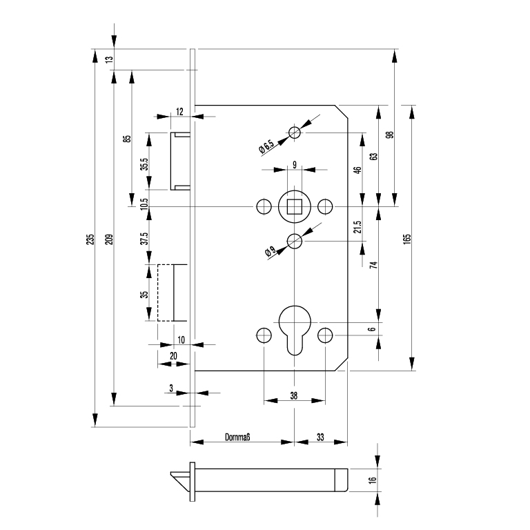 ohne Panikfunktion, Dornmass 65 mm, Stahlfalle, Riegel aus Zinkdruckguss 2-tourig, Riegelvorschub 20 mm, Nuss 9 mm, Mitte Nuss bis Oberkante Schlosskasten 63 mm