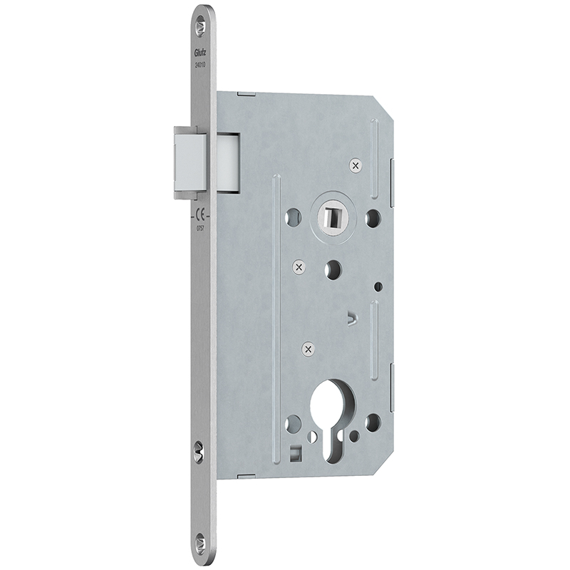 Serrure à mortaiser GLUTZ 24010, sans pêne dormant, avec bec-de-cane Delrin, avec têtière ronde 18 x 230 mm inox mat, fouillot 9 mm