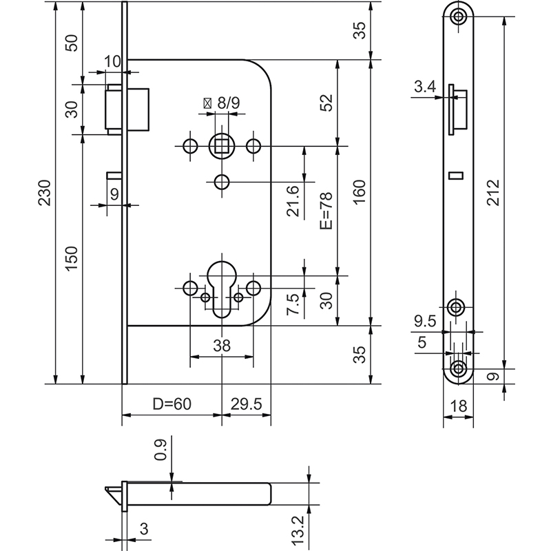 ohne Riegel, mit Zwangsnuss, Stahlfalle, Fallendämpfung, Fallenblockierung mit breiter Steuerfalle, Steuerfalle wird mit Schlossfalle zurückgezogen, mit Wechselfunktion, für Geschäftshäuser, Verwaltungsbauten, Schulhäuser, Krankenhäuser und gehobenen Wohnungsbau, durch die Fallenblockierung auch geeignet für stumpfeinschlagende Türen, ohne Schliessblech