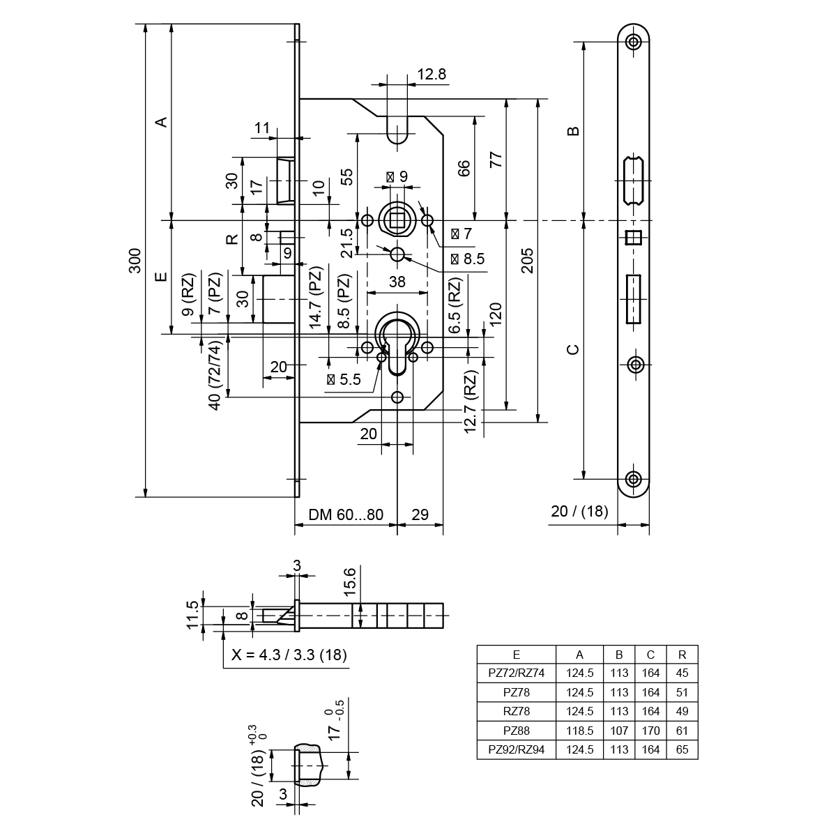 Einsteckschloss GLUTZ MINT 18908 ES SV ELK BK, selbstverriegelnd, elektrisch beidseitig kuppelbar, umstellbare Komfortfalle, Rundstulp 18 / 20 x 300 mm, Edelstahl matt