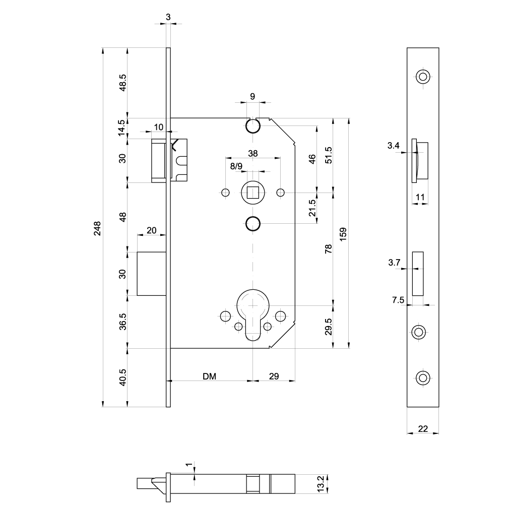 Objektschloss für Aussen-, Haus- und Wohnungsabschlusstüren, mit Fallenblockierung, Falle und Riegel vernickelt aus gehärtetem Spezialstahl, Riegel 1-tourig, Riegelvorschub 20 mm, mit Zwangsnuss, mit Wechselfunktion, ohne Schliessblech
