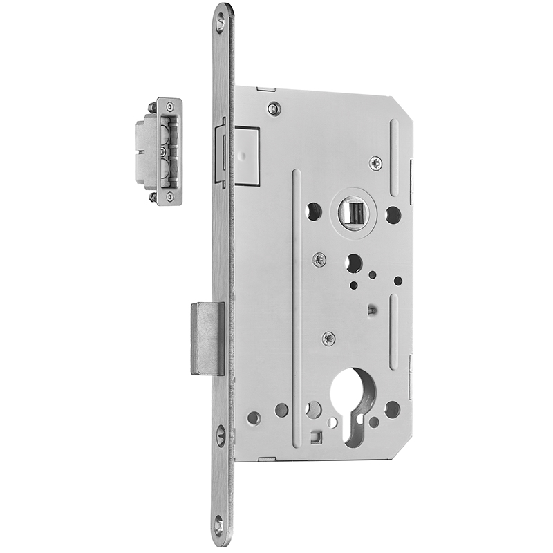Magnet-Einsteckschloss mit verstellbarem Magnetfallenhalter und Stahl-Hauptriegel, für alle Vollblatt-Innentüren - gefälzt wie stumpf, als komplettes Set für Stahlzargen oder in Kombination mit GLUTZ Flachschliessblech 22810 für Holzrahmen, die Technologie der Delrin-Magnetfalle bietet mehrere Vorteile, durch die flächenbündige Falle im Stulp entsteht ein elegantes Türblattdesign, es können formschlüssige Flachschliessbleche ohne Lappen eingesetzt werden und Kratzer / Farbschäden an Türrahmen gehören der Vergangenheit an, die Reinigung wird vereinfacht, da keine Ansammlungen von Schmutz und Fett entstehen können, das Gesamtsystem ist sehr leise durch die spezielle Dämpfung der Delrin-Magnetfalle und die perfekte Einstellbarkeit der Tiefe der Magnete, weiter ist eine schwache Einstellung des Türschliessers möglich, da die Delrin-Magnetfalle keinen Widerstand beim Einlauf verursacht, ohne Schliessblech