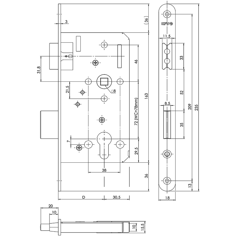 Magnet-Einsteckschloss KFV® 116, mit Rundstulp 18 x 235 mm Edelstahl matt
