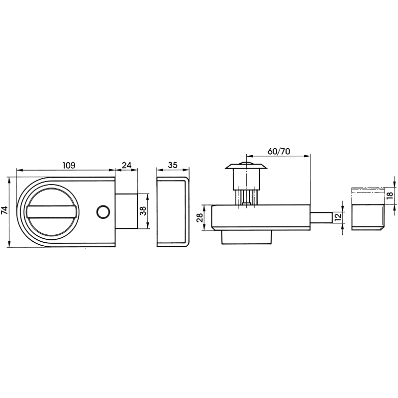 Gehäuse Zink-Druckguss, lackiert, innen mit Drehgriff, aussen mit Zylinder, Riegel 2-tourig, Riegelvorschub 24 mm, Dornmass 60 / 70 mm, mit optischer Verriegelungsanzeige rot/grün,