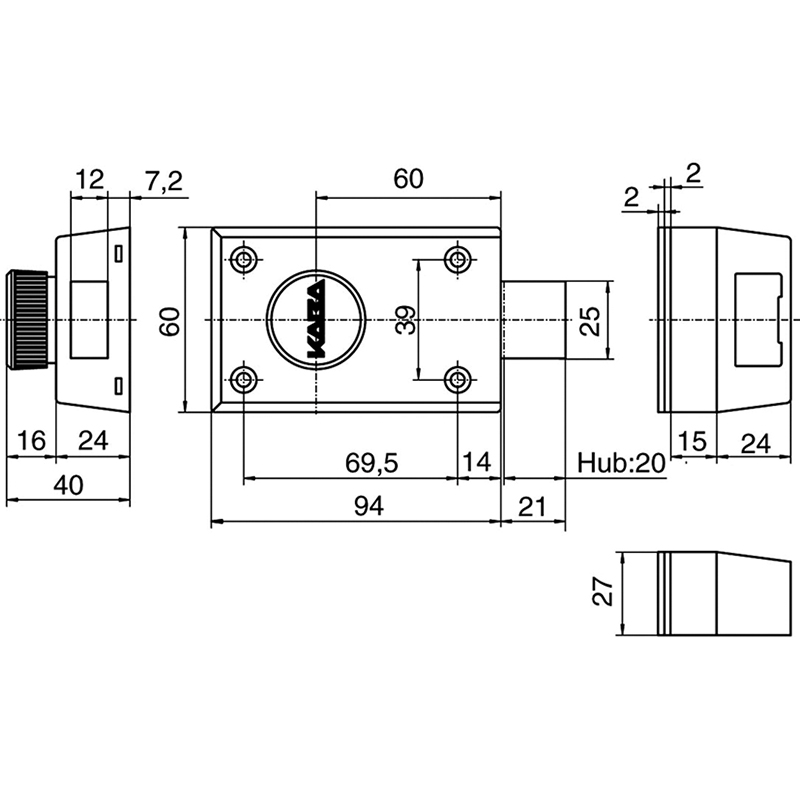 Riegelschloss KABA 1001A mit Aussenzylinder 1007, Dornmass 60 mm