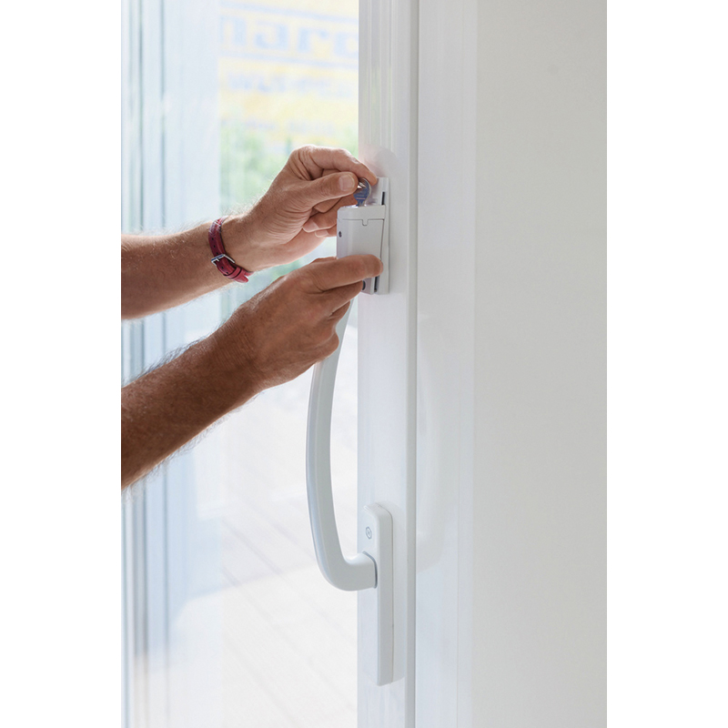 Stahl verzinkt weiss, für Hebetüren und Hebeschiebetüren, durch Verriegeln des Hebels wird die Hebetür wirksam gegen Öffnen von aussen geschützt, auch als Kindersicherung geeignet, umfasst den Kipphebel, um das seitliche Wegdrücken zu verhindern, mit 2 Schlüssel