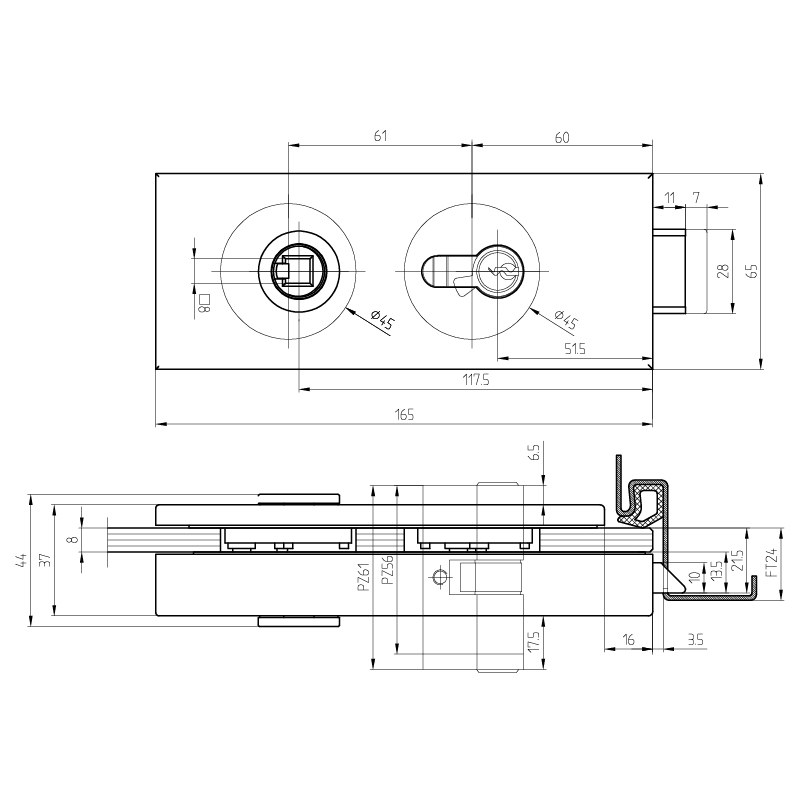 hinten | PZW | farblos eloxiert F1 | Aluminium | 165 | 65 | 8 - 10 | 8 | 1-flüglig, 2-flüglig | DIN universal | Studio | Glastürschloss | 10.003 | |
