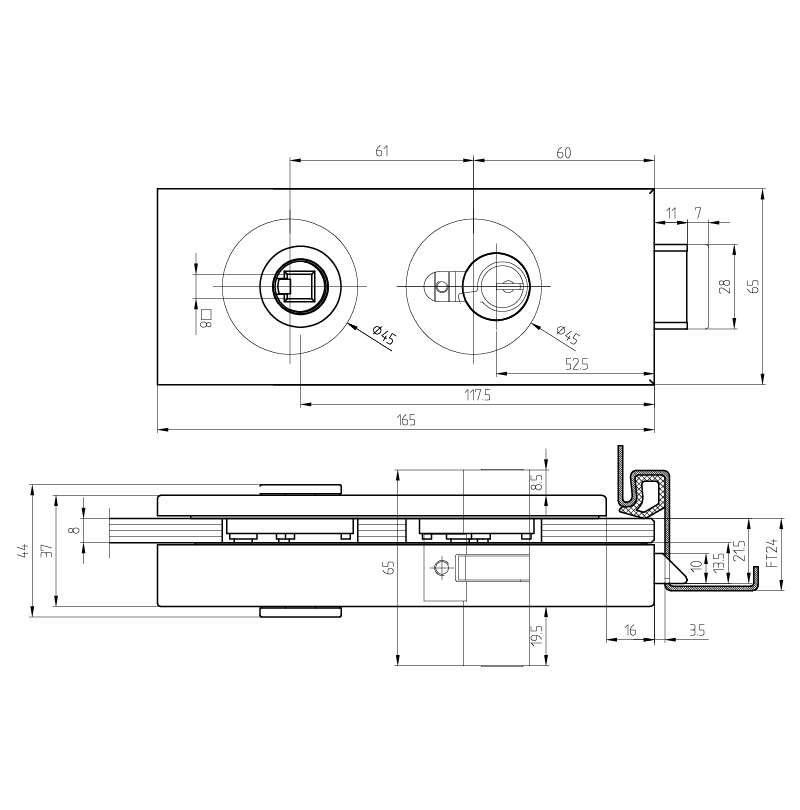 vorne | ohne | farblos eloxiert F1 | Aluminium | 165 | 65 | 8 - 10 | 8 | 1-flüglig, 2-flüglig | DIN universal | Studio | Glastürschloss | 10.002 | |