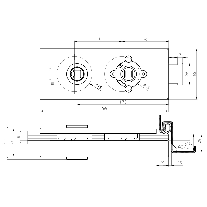 Aluminium eloxiert oder pulverbeschichtet (schwarz),Flüster-Komfort-Geräuschdämpfung, für Glasstärke 8 mm (Falztiefe 24 mm) oder Glasstärke 10 mm (Falztiefe 26 mm), geeignet für Drücker ohne Rosetten mit 8 mm Vierkantstift und Drückerführung Ø 18 mm, max. 8 mm lang, ohne Drücker, ohne Zylinder