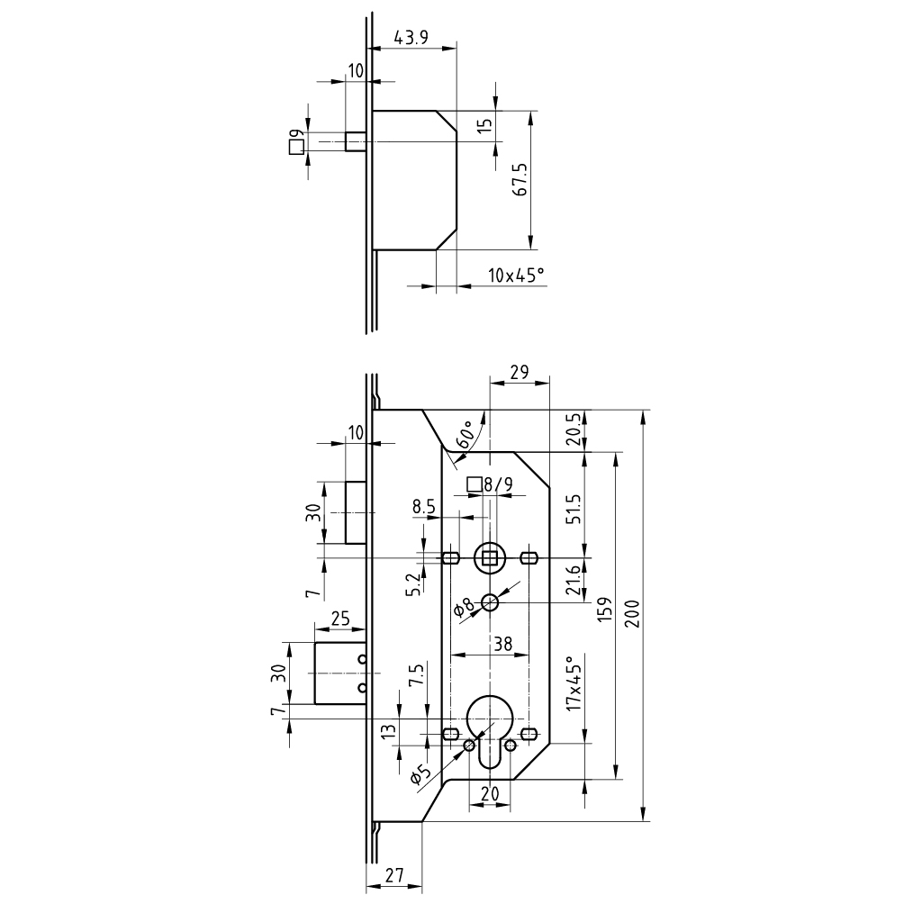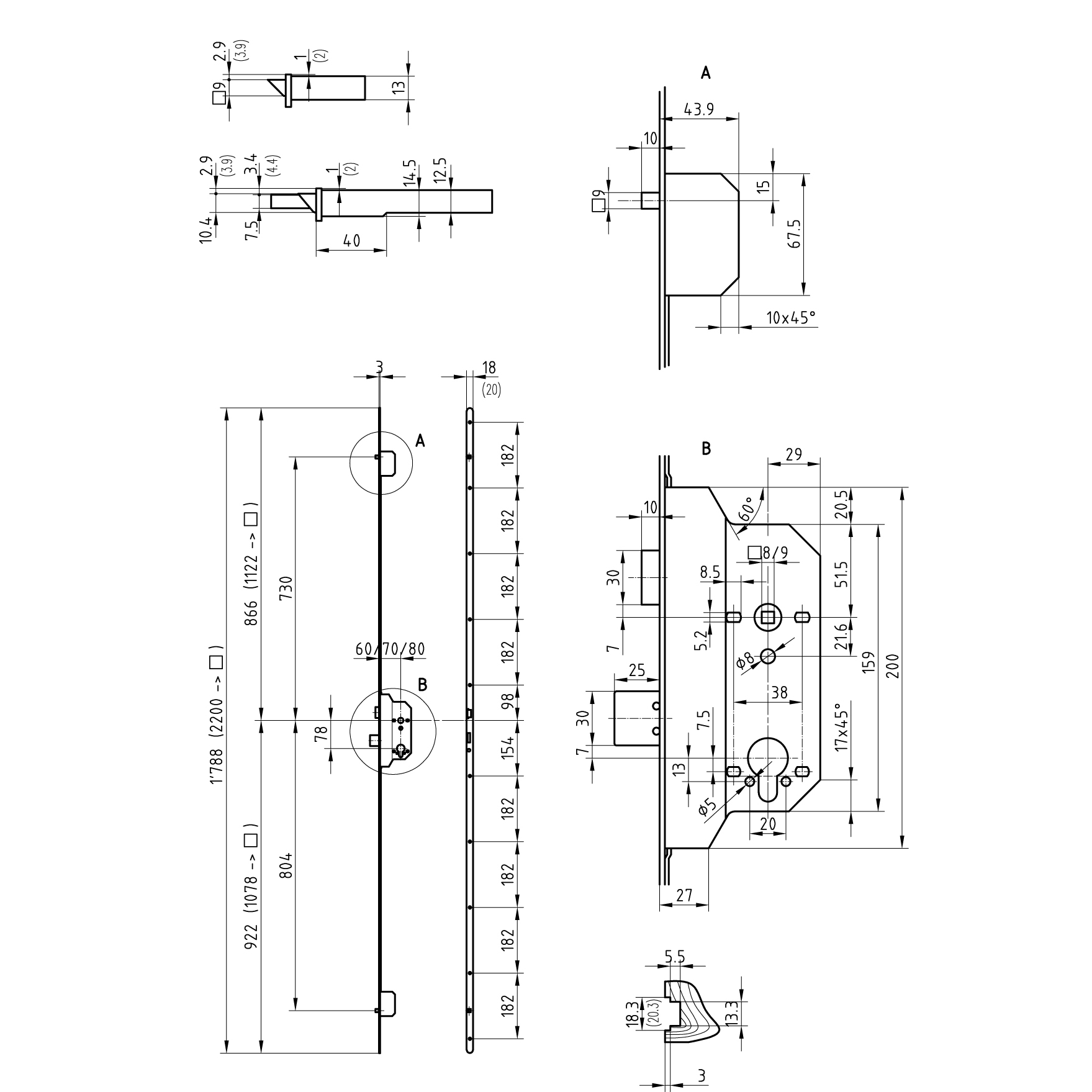 Mehrpunktverriegelung für Brandschutztüren, mit Zwangsnuss, mit Stahlfalle, Riegel 2-tourig, Riegelvorschub 2 x 12,5 mm, ohne Wechsel
