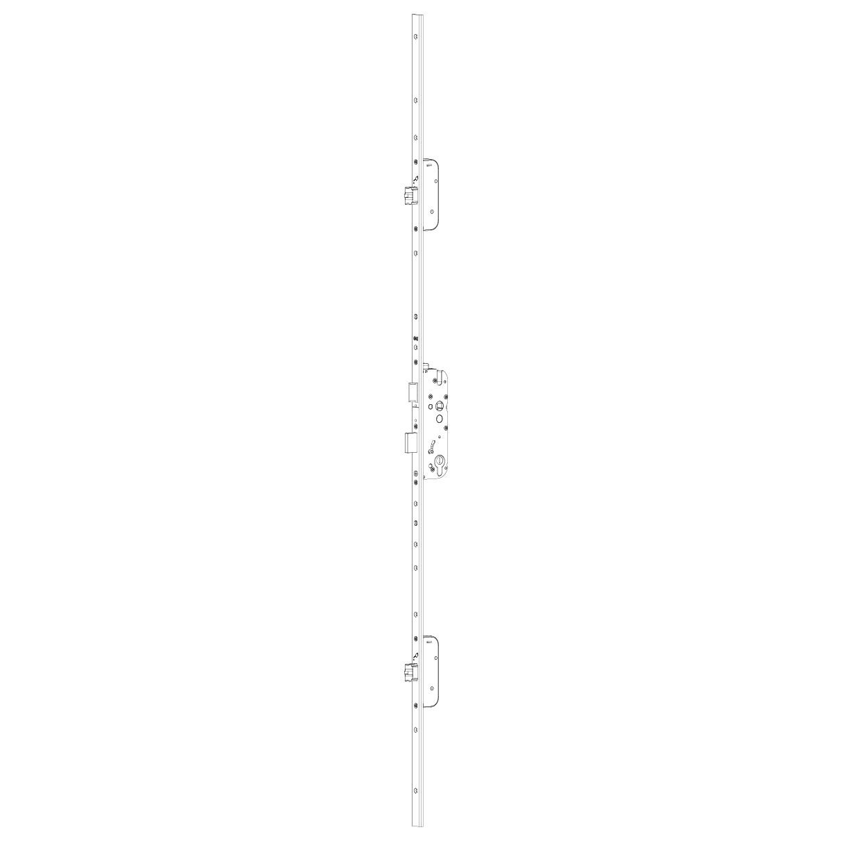 3-Punkt-Verriegelung durch Hauptriegel und 2 Automatic-Fallenriegel, DIN rechts und DIN links umstellbar, Riegelvorschub 20 mm, Riegel sind gegen zurückdrücken blockiert, Drücker blockiert, mit Wechsel, ist der Hauptriegel nicht über den Zylinder vorgeschoben, kann von innen die Türe durch Drückerbetätigung geöffnet werden, wird die Türe von Hand zugezogen, verriegelt die Türe automatisch über die 2 Fallenriegel oben und unten, die Türe ist im geschlossenen Zustand immer verriegelt, mit feuergeprüfter Falle, Kennkerbe 1020 mm, Riegelsitze 730 / 760 mm, Mass Mitte Nuss bis Oberkante Schlosskasten 79 mm, nachrüstbar, vorgerichtet für A-Öffner, ohne A-Öffner