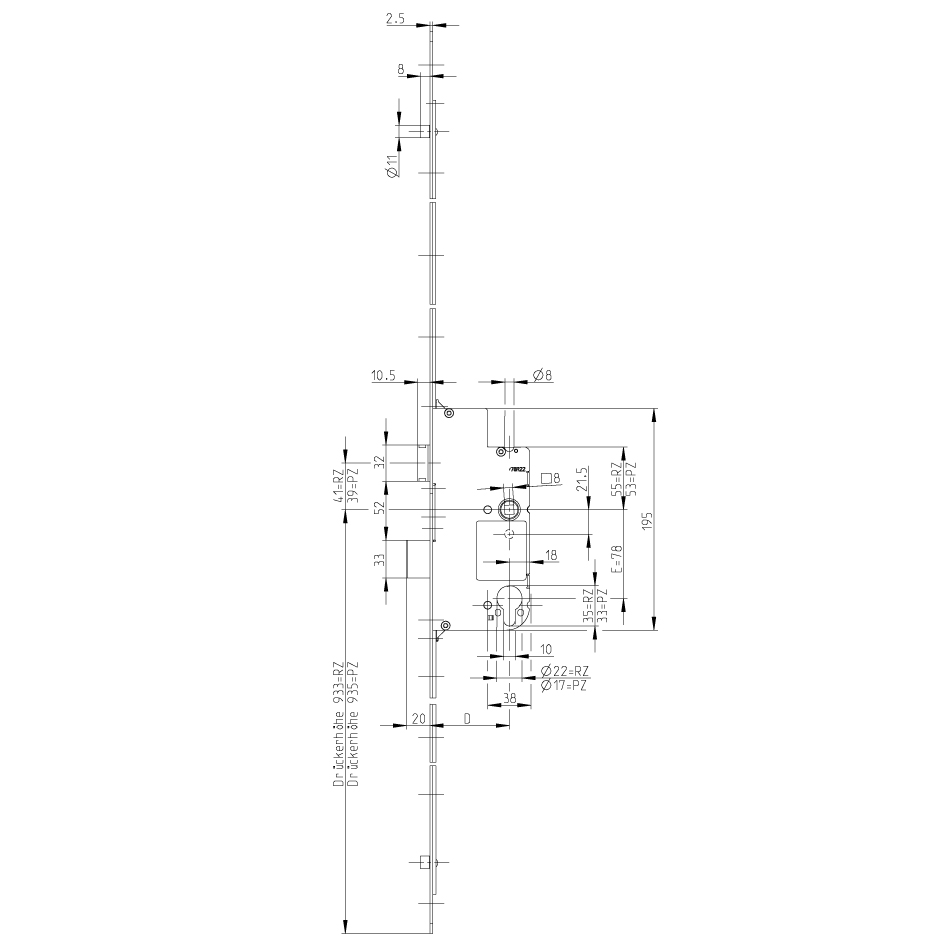 3-Punkt-Verriegelung durch Hauptriegel und 2 verstellbaren Rollzapfen, mit Zinkfalle, DIN rechts und DIN links umstellbar, Riegel 1-tourig, Riegelvorschub 20 mm, Öffnungs- und Schliessvorgang durch Drückerbetätigung, durch den Zylinder wird diese Funktion blockiert oder wieder freigeschaltet, Mass Mitte Nuss bis Oberkante Schlosskasten 55 mm
