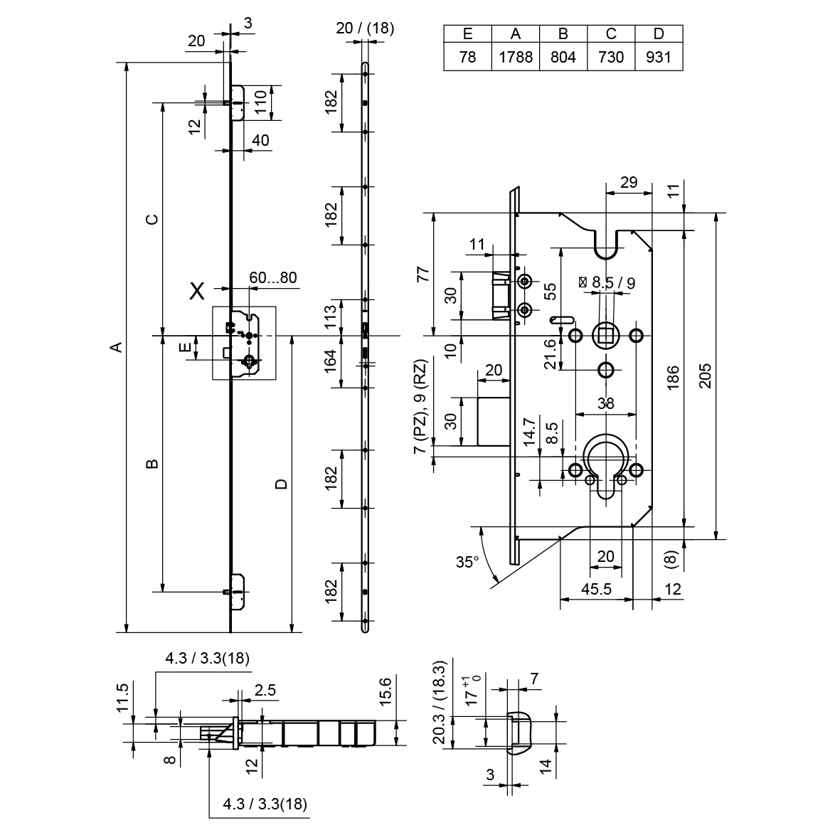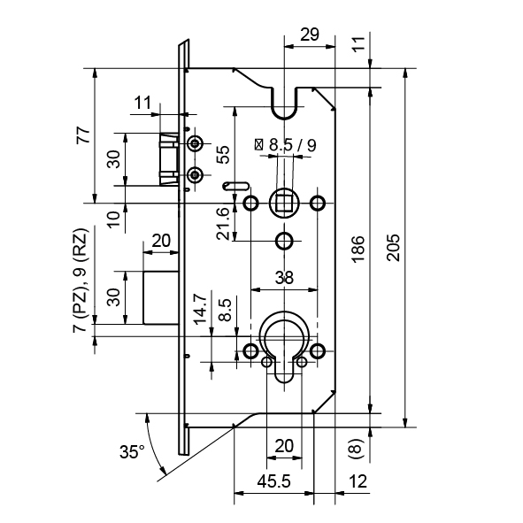Stahl verzinkt, mit Ausschnitt für Riegel und Falle, sowie für Riegelbolzen oben und unten von Mehrpunktverriegelungen Mint 1893, universal DIN rechts und DIN links verwendbar, ohne Schrauben