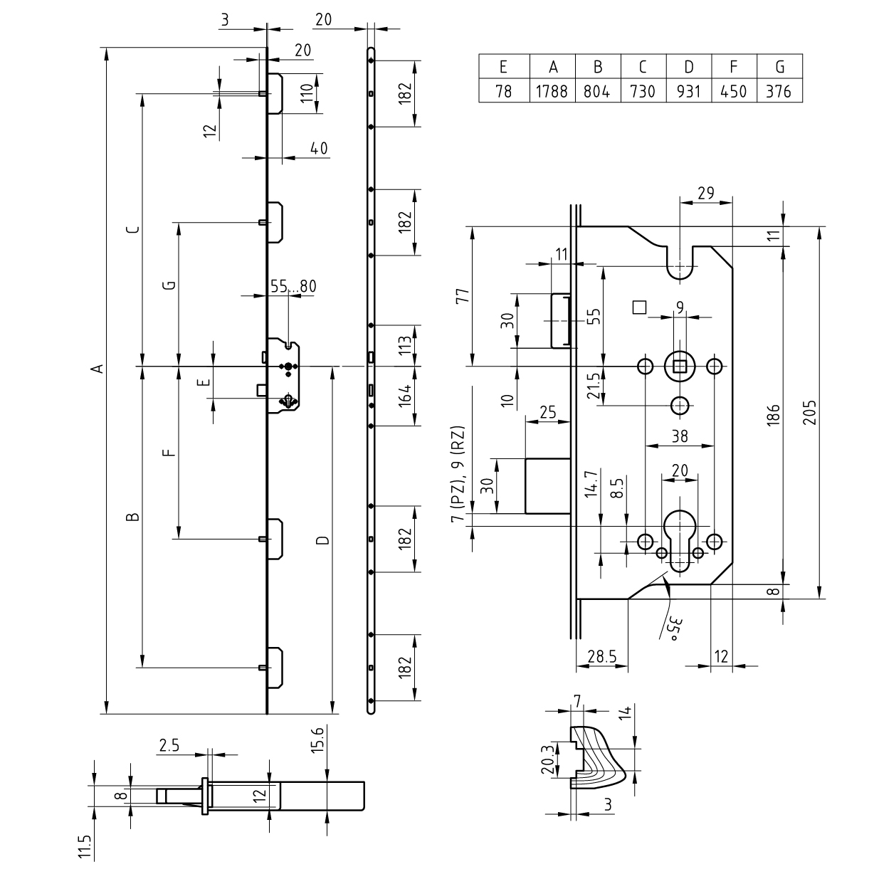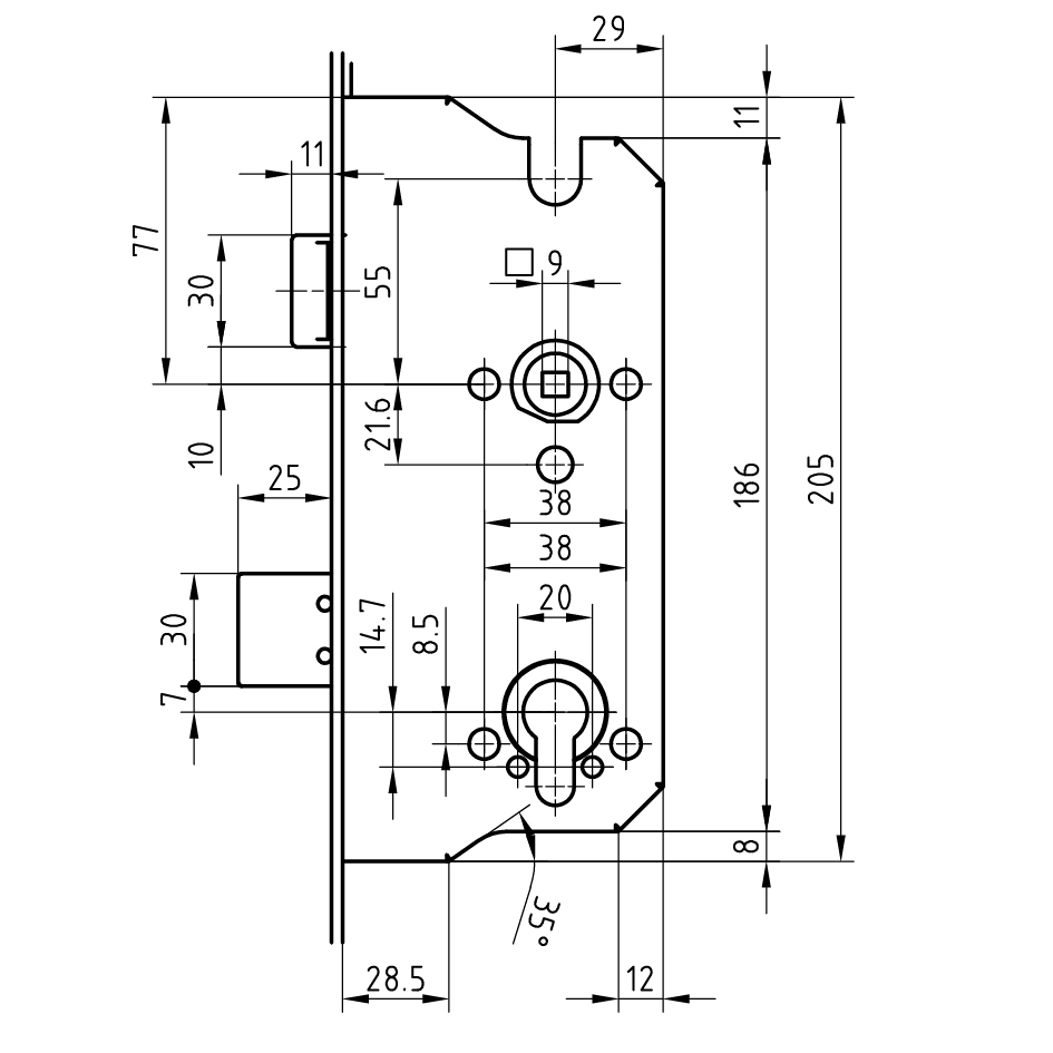 Stahl verzinkt, mit Ausschnitt für Riegel und Falle, sowie für Riegelbolzen oben und unten von Mehrpunktverriegelungen Mint 1895, universal DIN rechts und DIN links verwendbar, ohne Schrauben