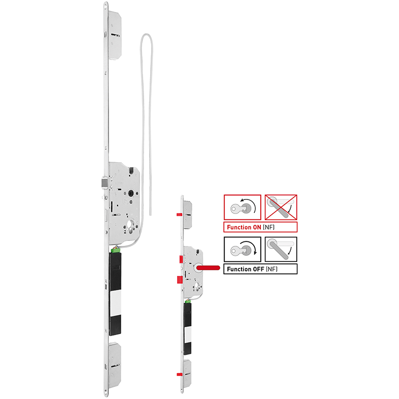 selbstverriegelnde Mehrfachverriegelung mit integrierter Fallenblockierung, DIN links und rechts umstellbare Komfortfalle mit Blockierung, Ablaufsteuerung und Nachtfunktion, für den Einsatz in Haus- und Wohnungseingangstüren sowie im Wirtschaftsbau, der Austritt ist über den Innendrücker jederzeit ohne Nachtfunktion möglich, bei bewusst eingeschalteter Nachtfunktion über den Zylinder ist der Innendrücker blockiert, ein Austritt ist nur noch über die Wechselfunktion möglich, somit können z.B. Kinder das Haus nicht ohne Identifikationsmittel verlassen, gleichzeitig erhöht sich der Einbruchschutz, indem eine Manipulation des Innendrückers von aussen verhindert wird, die Bedienung von aussen erfolgt über den Zylinder / Wechselfunktion (Knopf / Stossgriff), geprüft nach DIN 18251-3, EN 14846, EN 1634, ohne Anschlusskabel