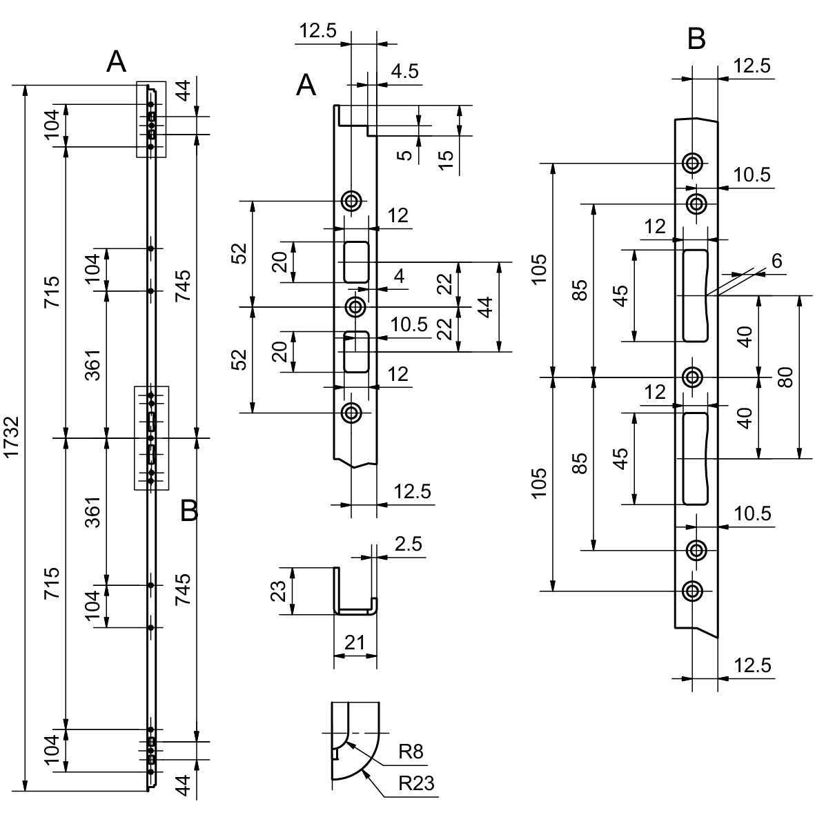 Stahl verzinkt, mit Ausschnitt für Riegel und Falle, sowie für Riegelbolzen oben und unten von Mehrpunktverriegelungen Mint 1893, universal DIN rechts und DIN links verwendbar, ohne Schrauben