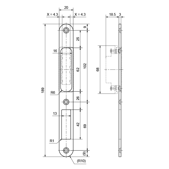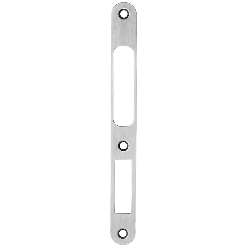 Flachschliessblech in Edelstahl für GLUTZ Magnet-Einsteckschloss 24100 in Kombination mit einem Holzrahmen, der zum Schloss mitgelieferte Magnetfallenhalter wird einfach von vorne ins Schliessblech montiert und über die speziellen Blindschrauben festgezogen, die Magnetkraft wird über die Tiefenverstellung im Magnetfallenhalter eingestellt, ohne Schrauben