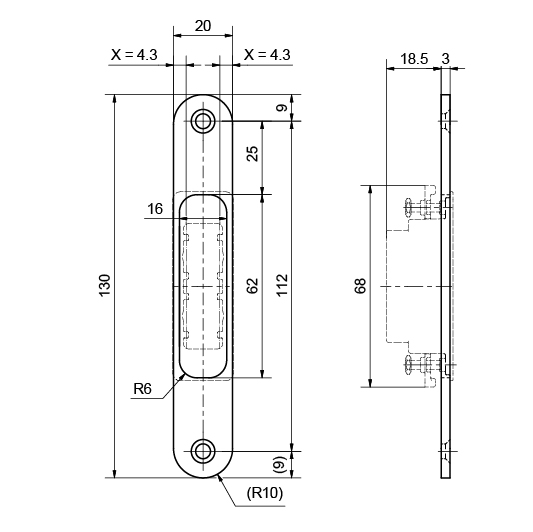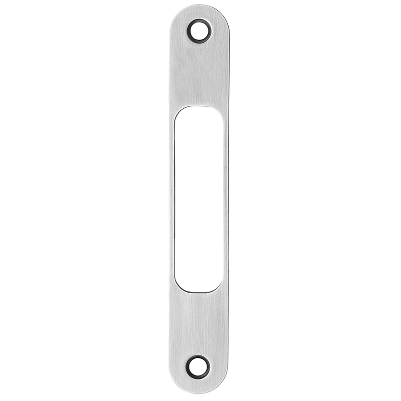 Flachschliessblech in Edelstahl für GLUTZ Panik-Magnet-Einsteckschloss 24110 in Kombination mit einem Holzrahmen, der zum Schloss mitgelieferte Magnetfallenhalter wird einfach von vorne ins Schliessblech montiert und über die speziellen Blindschrauben festgezogen, die Magnetkraft wird über die Tiefenverstellung im Magnetfallenhalter eingestellt, ohne Schrauben