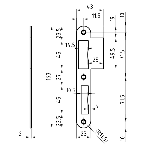 Stahl verzinkt oder Edelstahl matt, mit Ausschnitt für Riegel und Falle, universal DIN rechts und DIN links verwendbar, ohne Schrauben