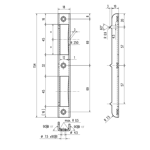 Stahl verzinkt oder vernickelt, mit Ausschnitt für Riegel und Falle, universal DIN rechts und DIN links verwendbar, ohne Schrauben