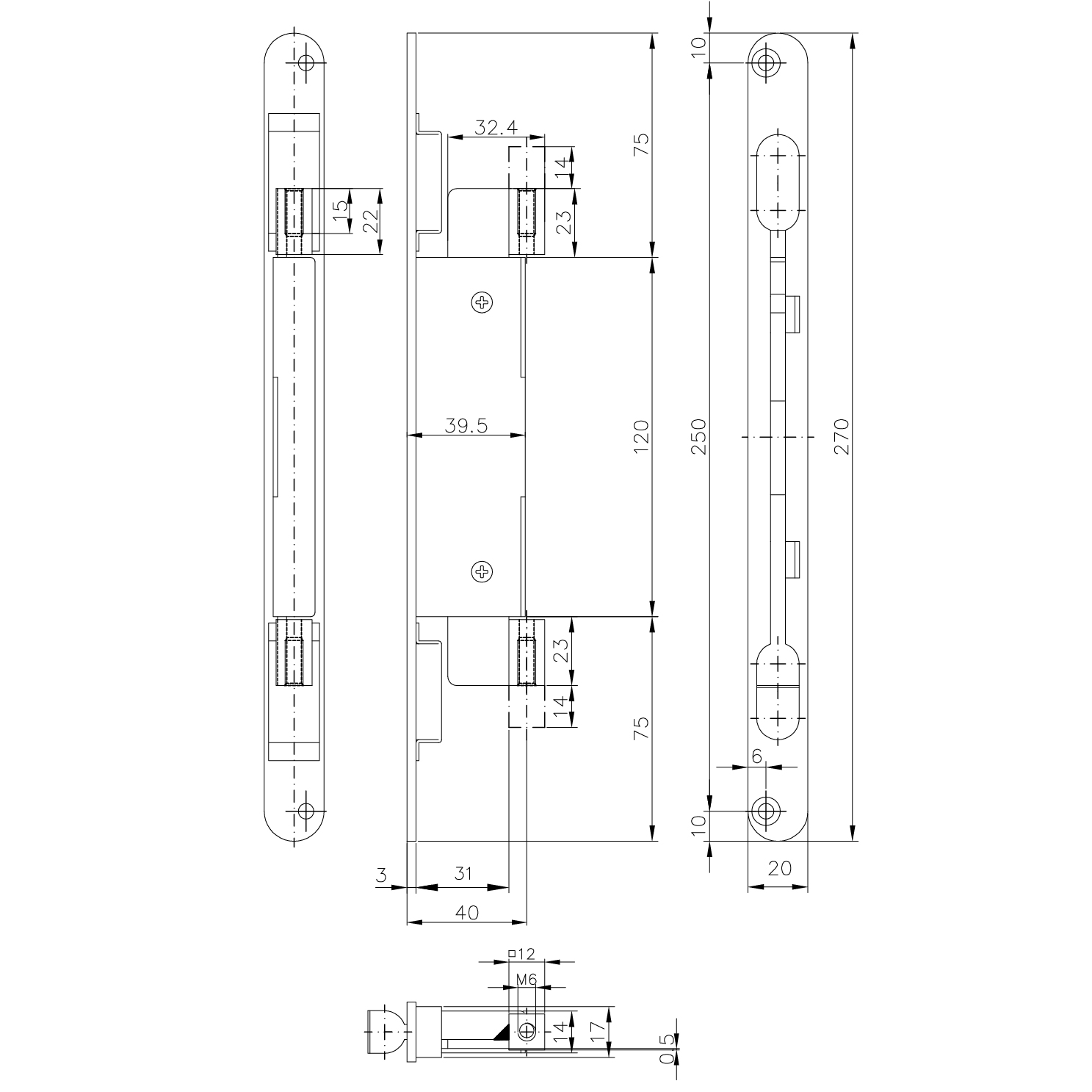 Stahl verzinkt, Kniehebel Messing, Stulp 20 x 270 mm abgerundet, für Standflügelverriegelung bei 2-flügligen Türen, ohne Zubehör