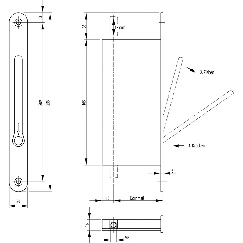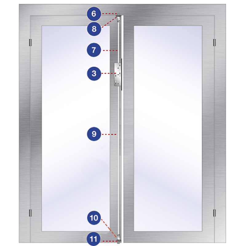 automatische Standflügelverriegelung für 2-flüglige Notausgangstüren in Kombination mit Schaltschloss, ohne Panikfunktion, mit Stangenanschluss M6 für Oben- und Unterverriegelung, wird der Standflügel geschlossen, löst das Schaltschloss die selbsttätige Verriegelung der abgefederten Treibriegelstangen nach oben und unten aus, der Standflügel kann nur bei offen stehendem Gangflügel entriegelt werden, durch Betätigen des Hebels werden die Treibriegelstangen manuell in das Türblatt gezogen, eine anschliessende Arretierung im Schaltschloss verhindert ein Ausfahren der Stangen und damit die Beschädigung des Bodenbelages, ohne Zubehör