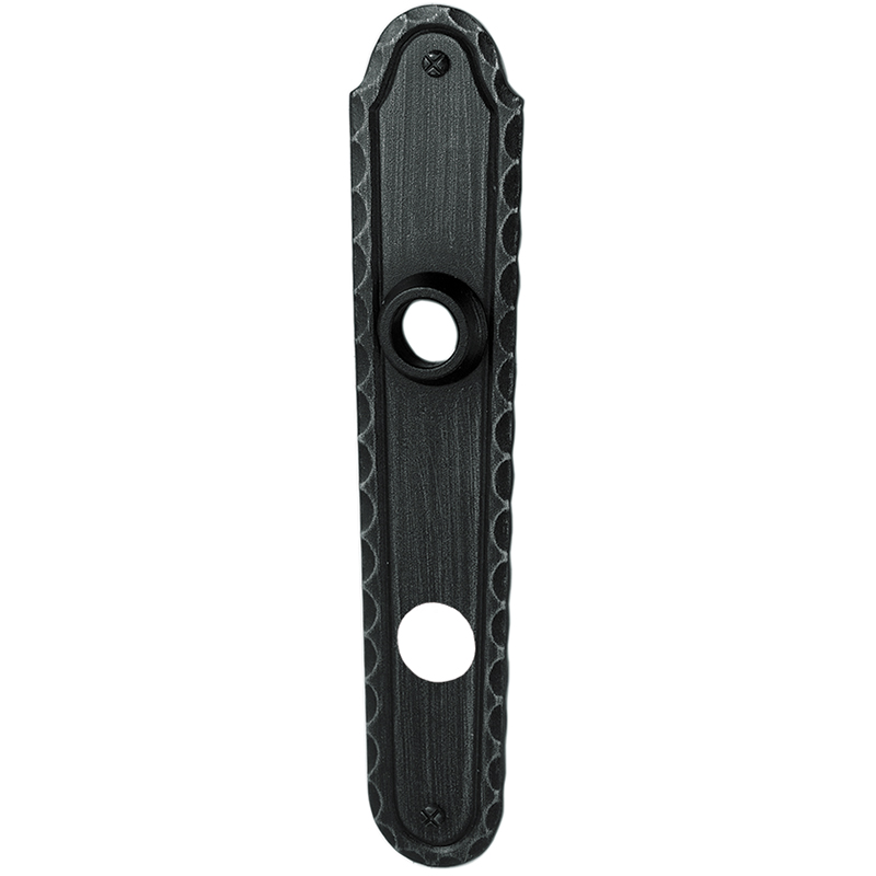 Schmiedeisen verzinkt und patiniert, Drückerführung 18 mm, oberes Schraubenloch bis Mitte Drückerführung 74 mm, mit Schrauben