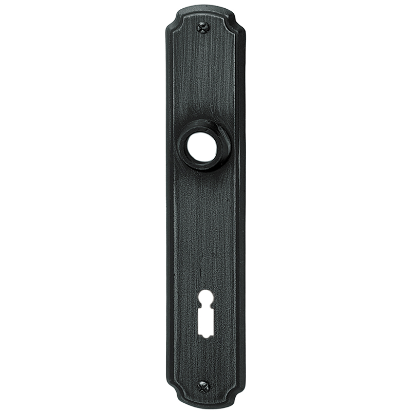 Schmiedeisen verzinkt und patiniert, Drückerführung 18 mm, oberes Schraubenloch bis Mitte Drückerführung 67 mm, mit Schrauben