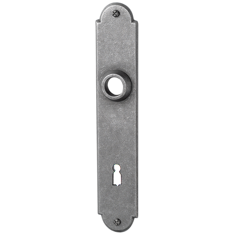 Schmiedeisen thermopatiniert®, Drückerführung 18 mm, oberes Schraubenloch bis Mitte Drückerführung 67 mm, mit Schrauben
